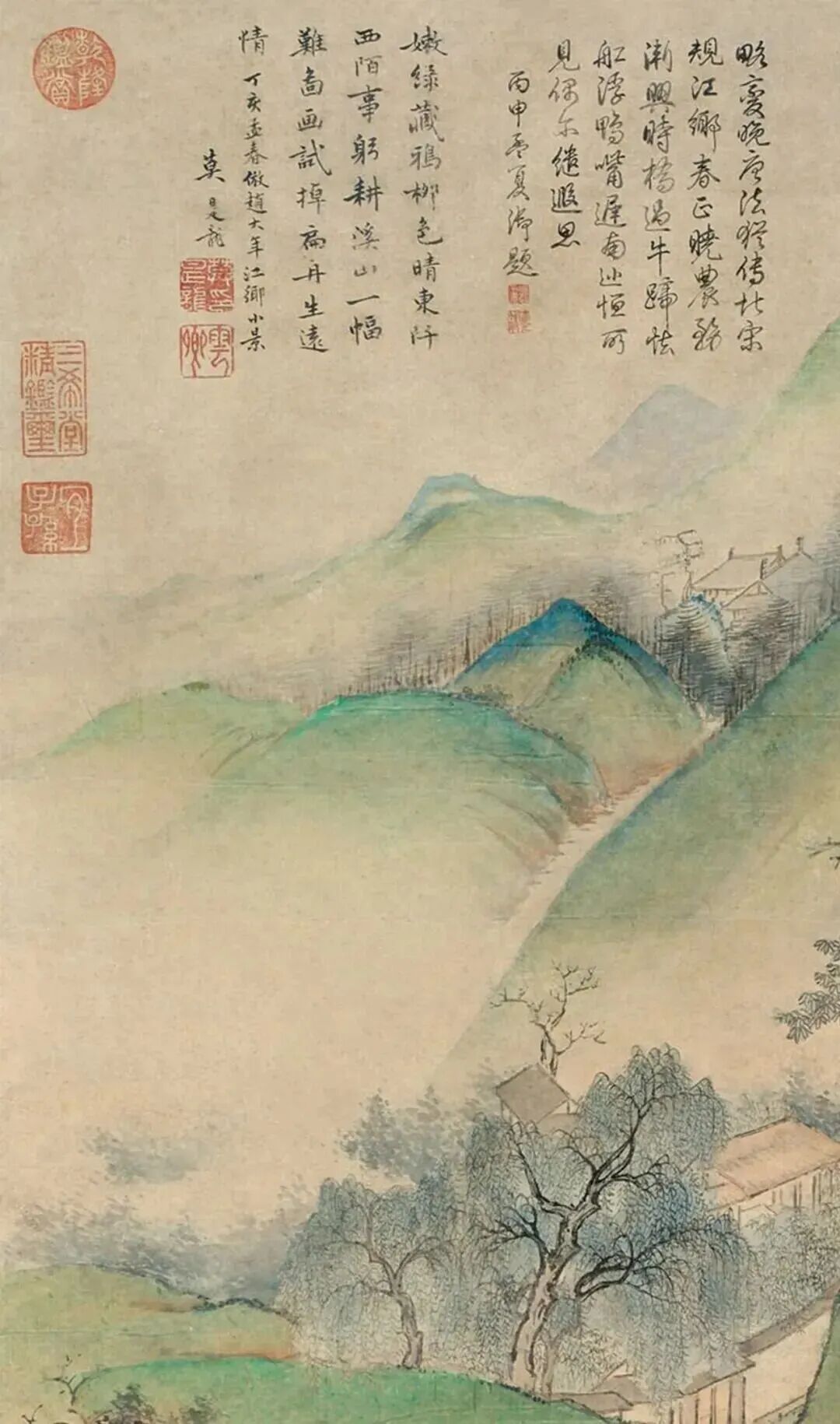 莫是龙这《江乡小景》,一瞅就是幅“治愈系”画作。尺寸不小,134×49.5厘米,往墙上一挂,那叫一个气派!