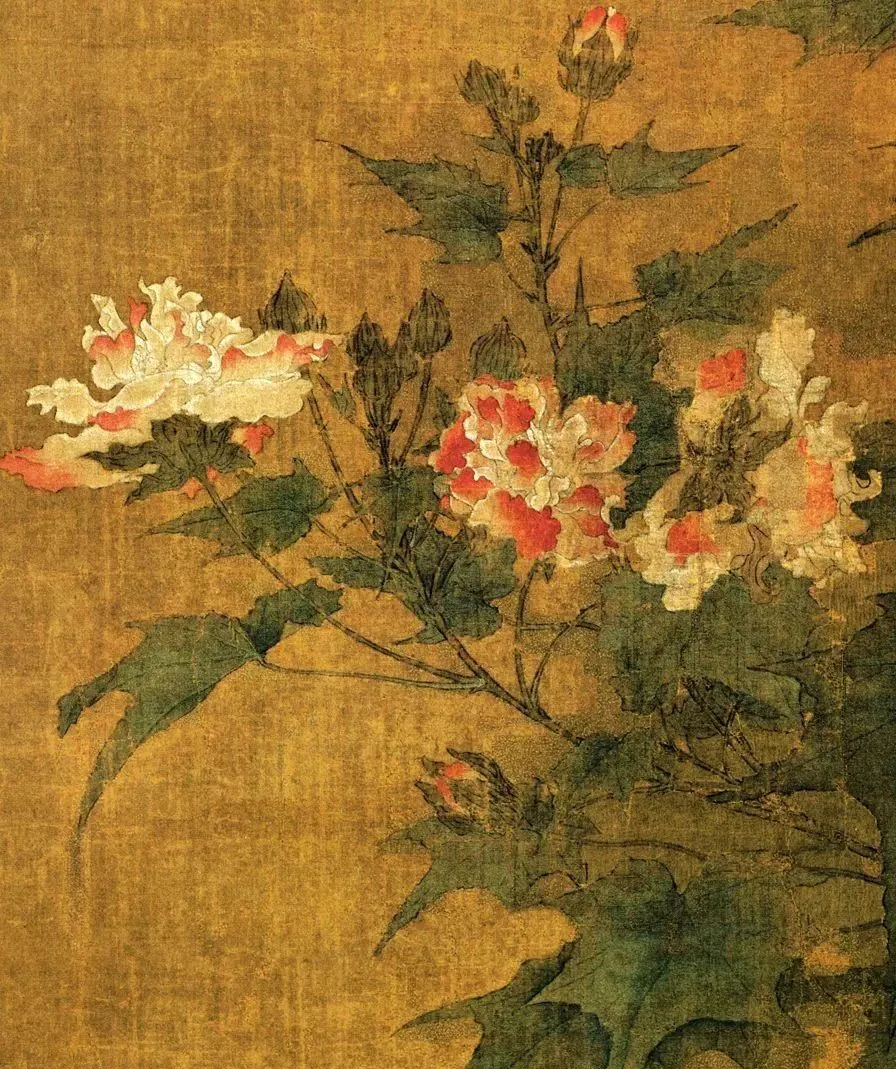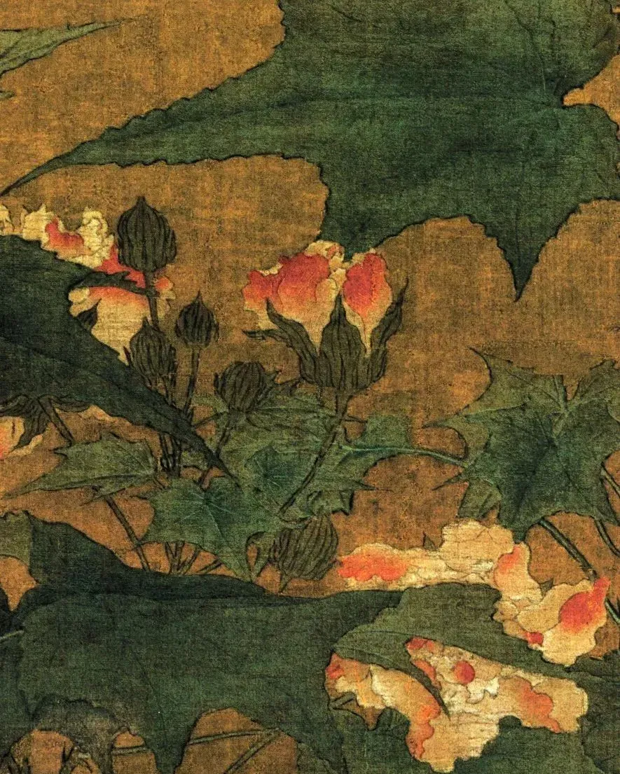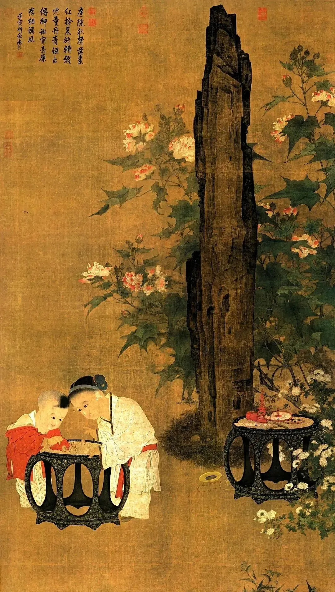 背景里,巨型太湖石撑起画面,芙蓉、雏菊点缀其间,既点明秋天,又营造出静美氛围。这构图也妙,太湖石和孩童形成对比,突出“婴戏”主题,就像给画面加了“特效”,让咱一眼就瞅见重点。