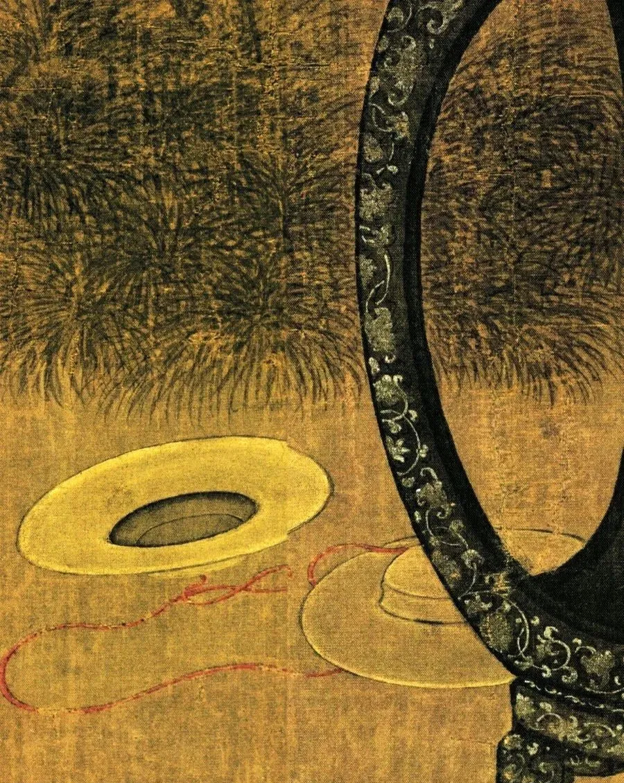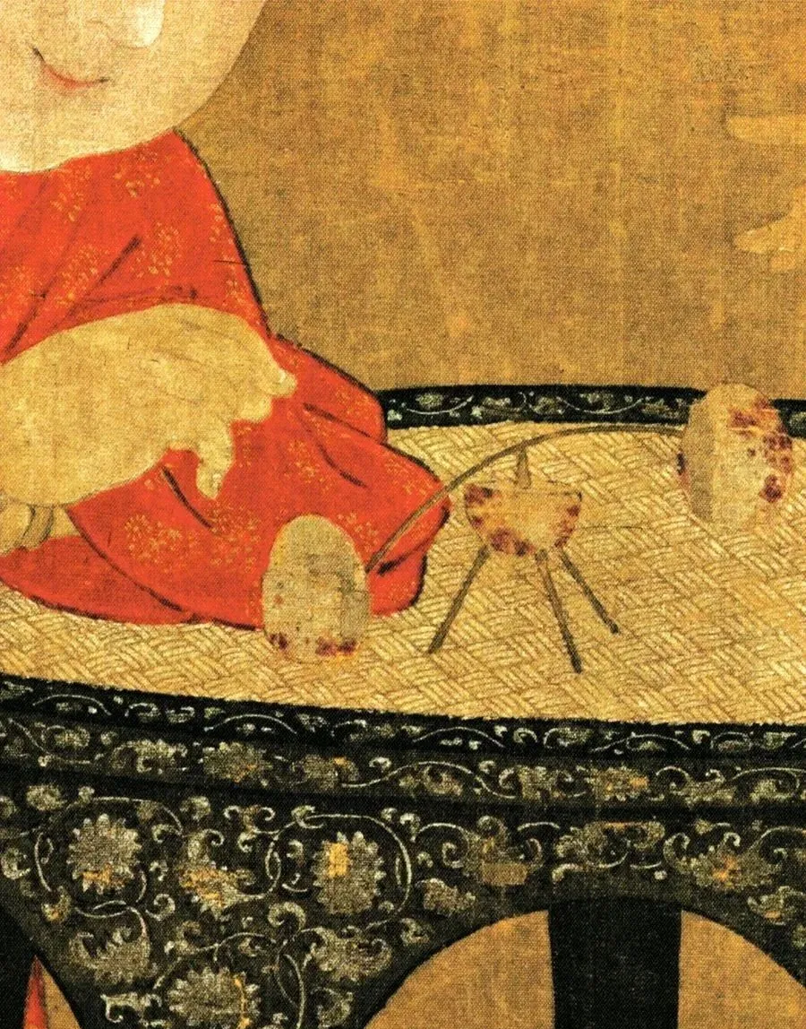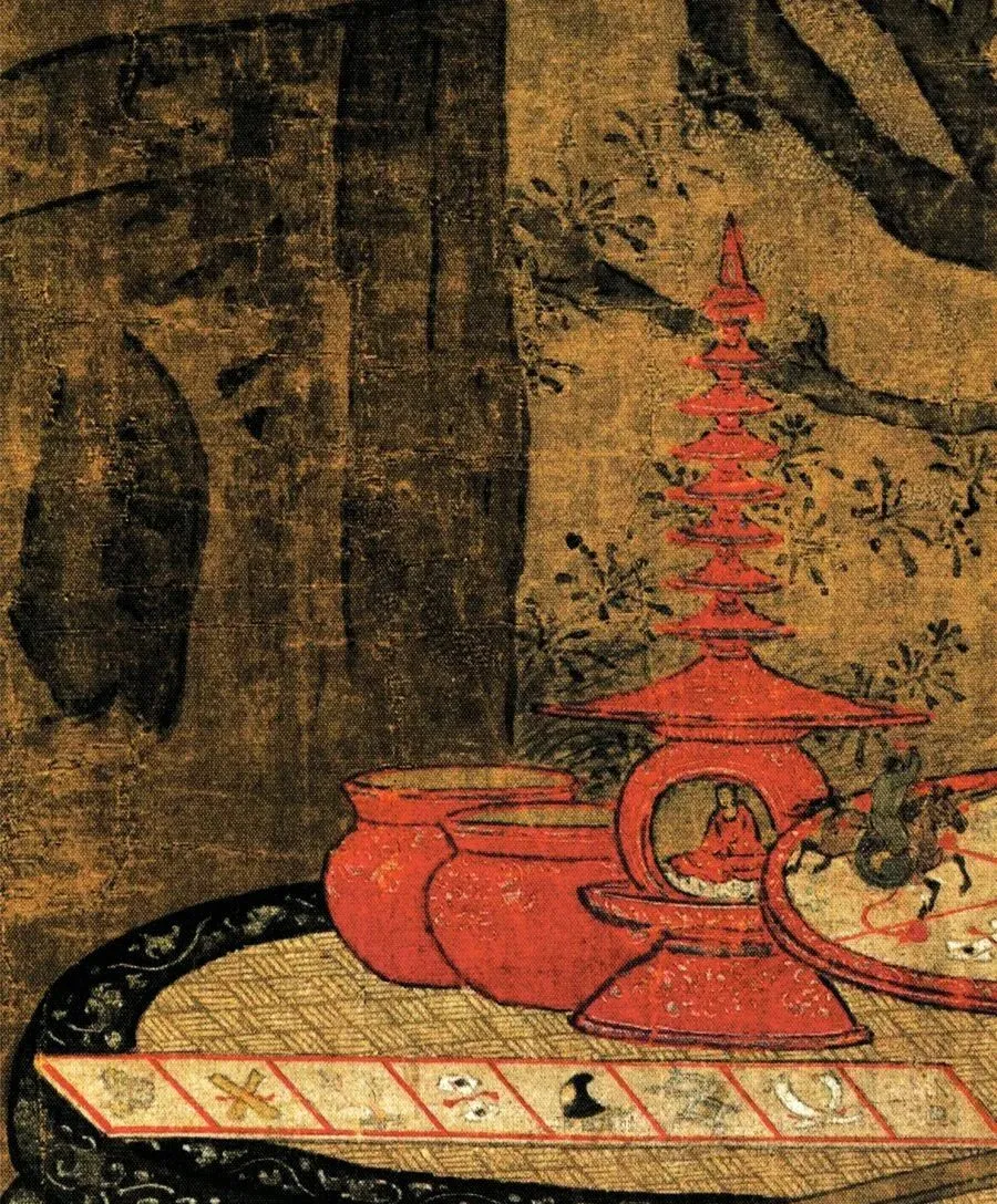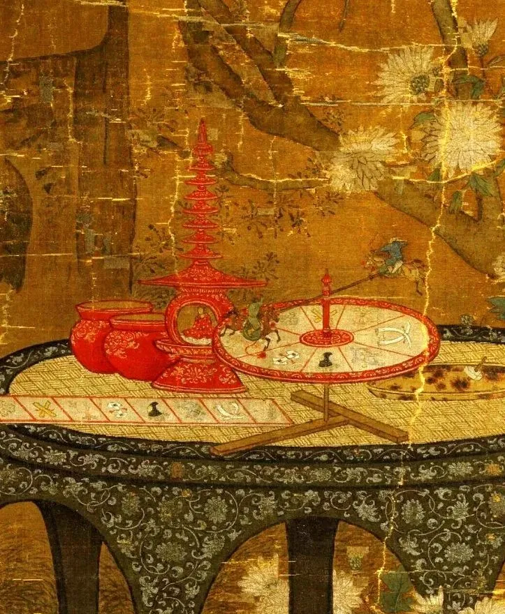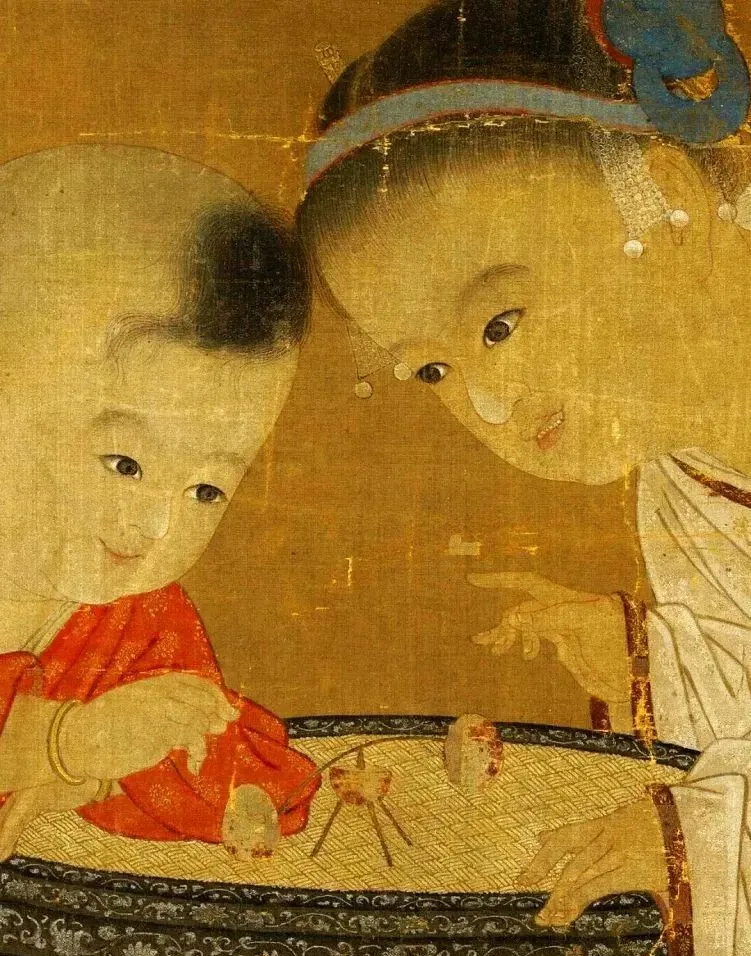 再看他们周围,圆凳上摆着红佛塔、人马转轮盘儿等一堆玩具,地上还散落着小铙钹。这些玩具精致得很,说明这姐弟家境不错,也反映出宋代孩子生活挺丰富。