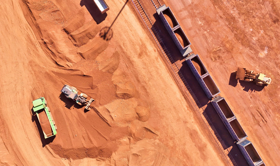 2026年3月9日,山东烟台,大批进口铝土矿石在山东港口烟台港被装入列车,准备发往电解铝企业。视觉中国/图
