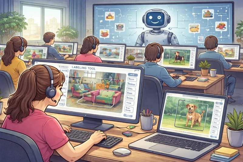 对于大多数 AI 来说,你扔给它的照片本质上只是符号和统计规律,而告诉它这些信息都代表了什么的,在过去是成千上万的人工标注员,他们通过手工框选贴标签,告诉 AI 图片中的水杯、桌子、车辆、宠物猫狗长什么样。