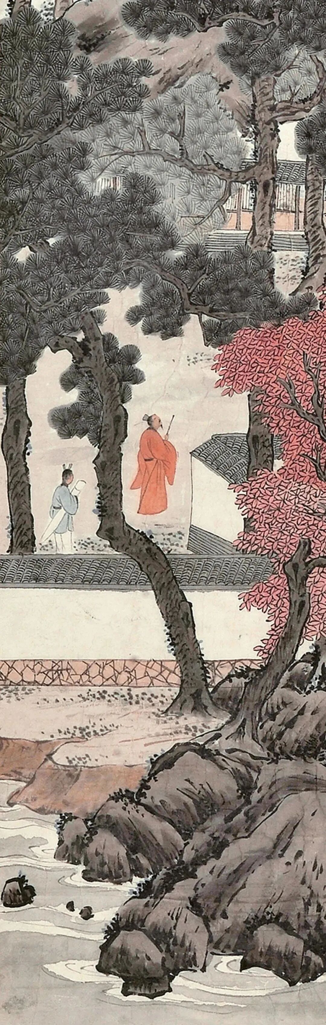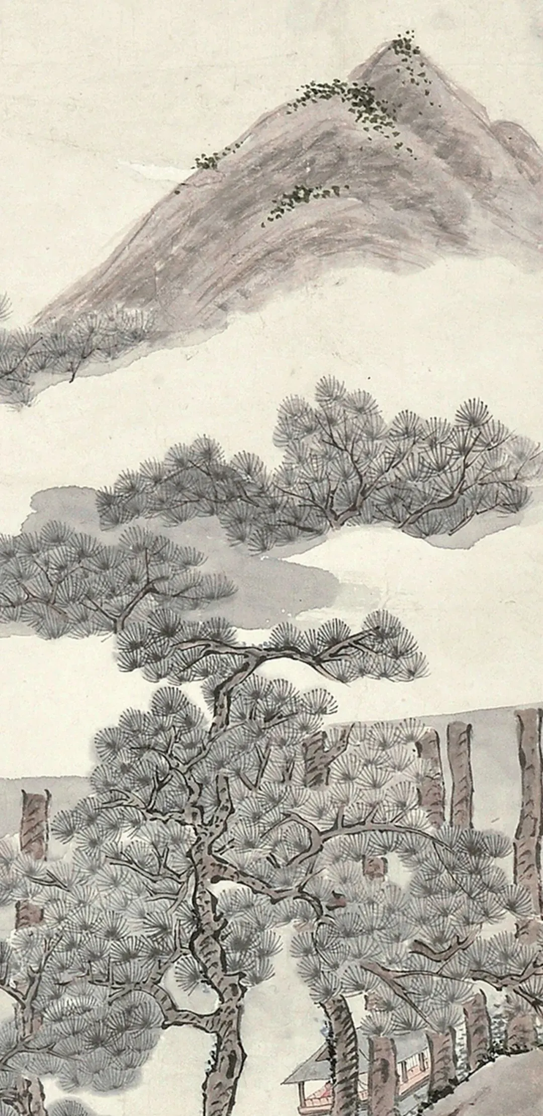 画里还有个人,坐在松树下,闭着眼睛,一脸享受。他可不是在打盹儿,而是在专心“听松”呢!那神情,仿佛整个世界就剩下他和这松涛声,外界的喧嚣都跟他没关系。