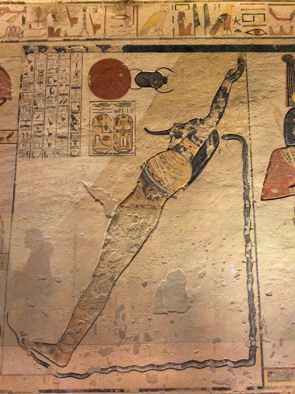 木乃伊背靠靠着一条蛇呈45度角斜躺,面前是圣甲壳虫和太阳圆盘,是在准备葬礼仪式,或在神祇面前等待重生。