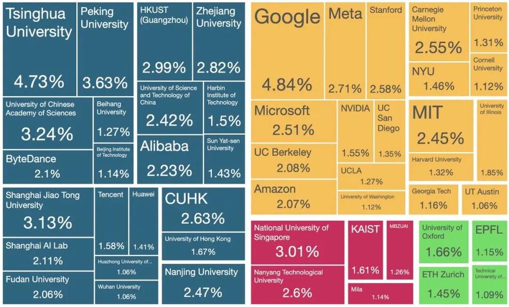 过去几年,中国机构在 NeurIPS 上的表现持续攀升。在 NeurIPS 2024 上,中国高校占据了论文录用数量前 20 名中的 8 个席位,浙江大学更是超过 MIT 成为录用论文最多的机构。到了 2025 年,NeurIPS 收到的有效投稿达到 21575 篇,其中来自中国的比例持续增长。