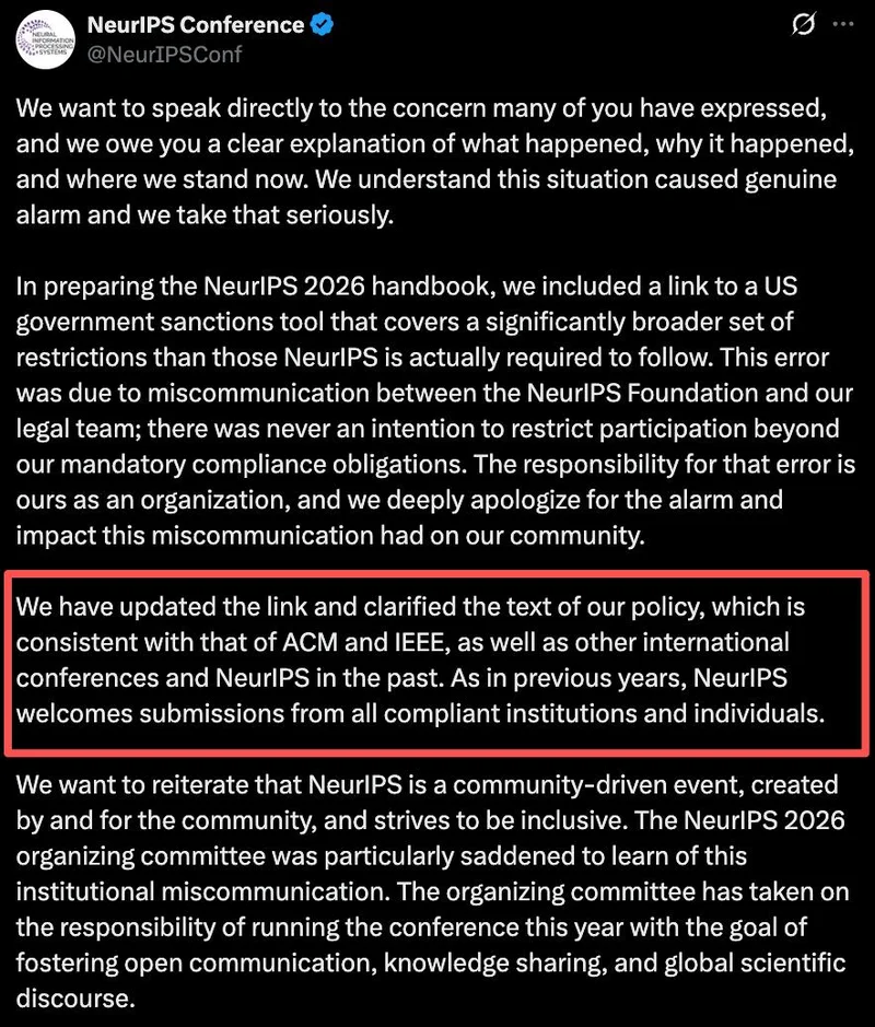 这次风波的直接原因,是NeurIPS因其非营利组织身份受美国法律管辖,为规避风险而采取了“过度合规”措施。