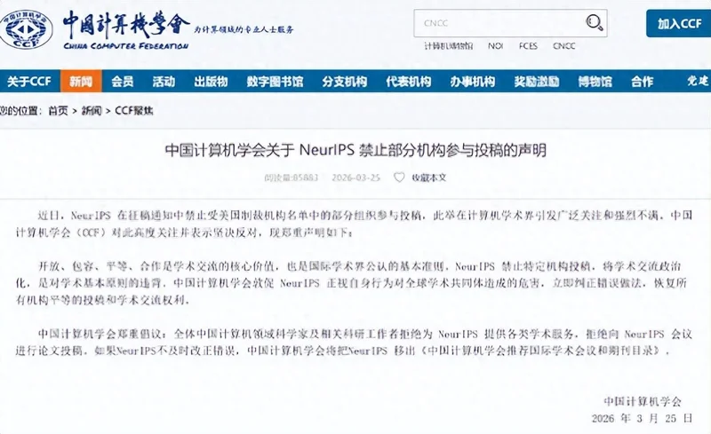 最近AI圈出了件大事,中国计算机学会(CCF)发布声明,强烈反对NeurIPS新增限制条款,并倡议中国学者暂停投稿与审稿。这背后的火药味有多大,明眼人一看就知。今天他们封杀中国学术,以后他们恐怕高攀不起。这一事件的导火索,是AI三大顶会之一NeurIPS今年新增了条款,只要你在美国的制裁名单上,就不许以任何方式参与——投稿、评审、当组委,全都被禁止。