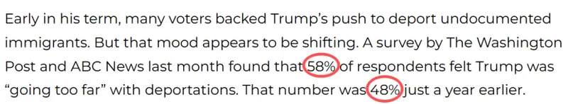 在特朗普任期初期,许多选民支持其驱逐无证移民的行动,但这种情绪正在发生变化。上个月的一项民调显示,58%的受访者认为特朗普在驱逐政策上“走得太远”,而一年前这一比例仅为48%。