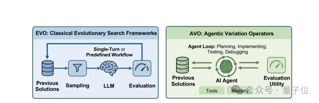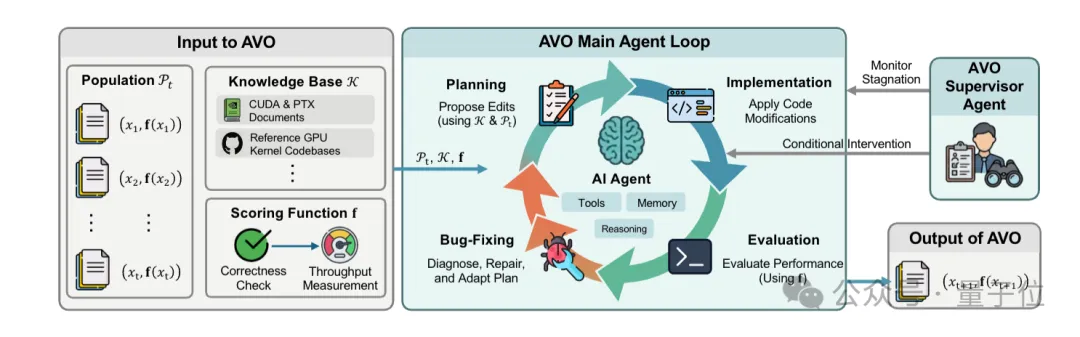 不同于传统变异算子,AVO直接将变异过程重构为一个自主导向的智能体循环,包括查阅现有迭代情况、领域专属知识库,以及修改测试验证等。