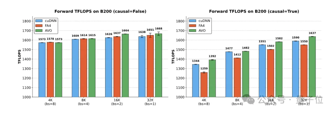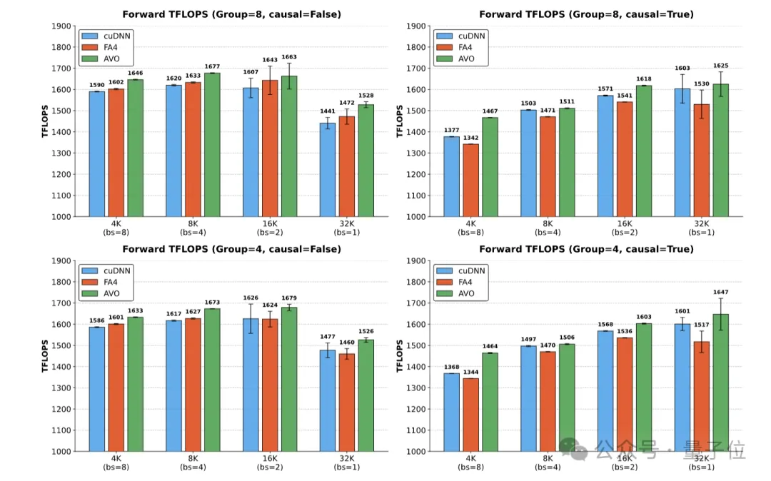同一款GPU上,AVO方案性能超出官方加速引擎cuDNN 3.5%,比当前公认最强的FlashAttention-4还快了10.5% 。