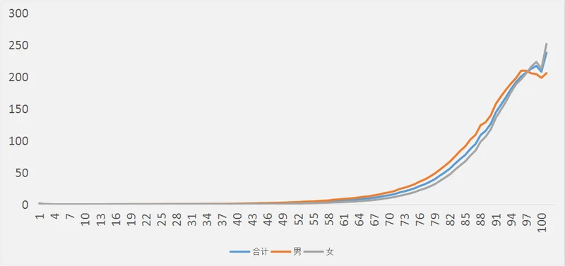 特别是,到70岁之后,快速上升。进入80岁后,死亡率曲线更加陡峭。