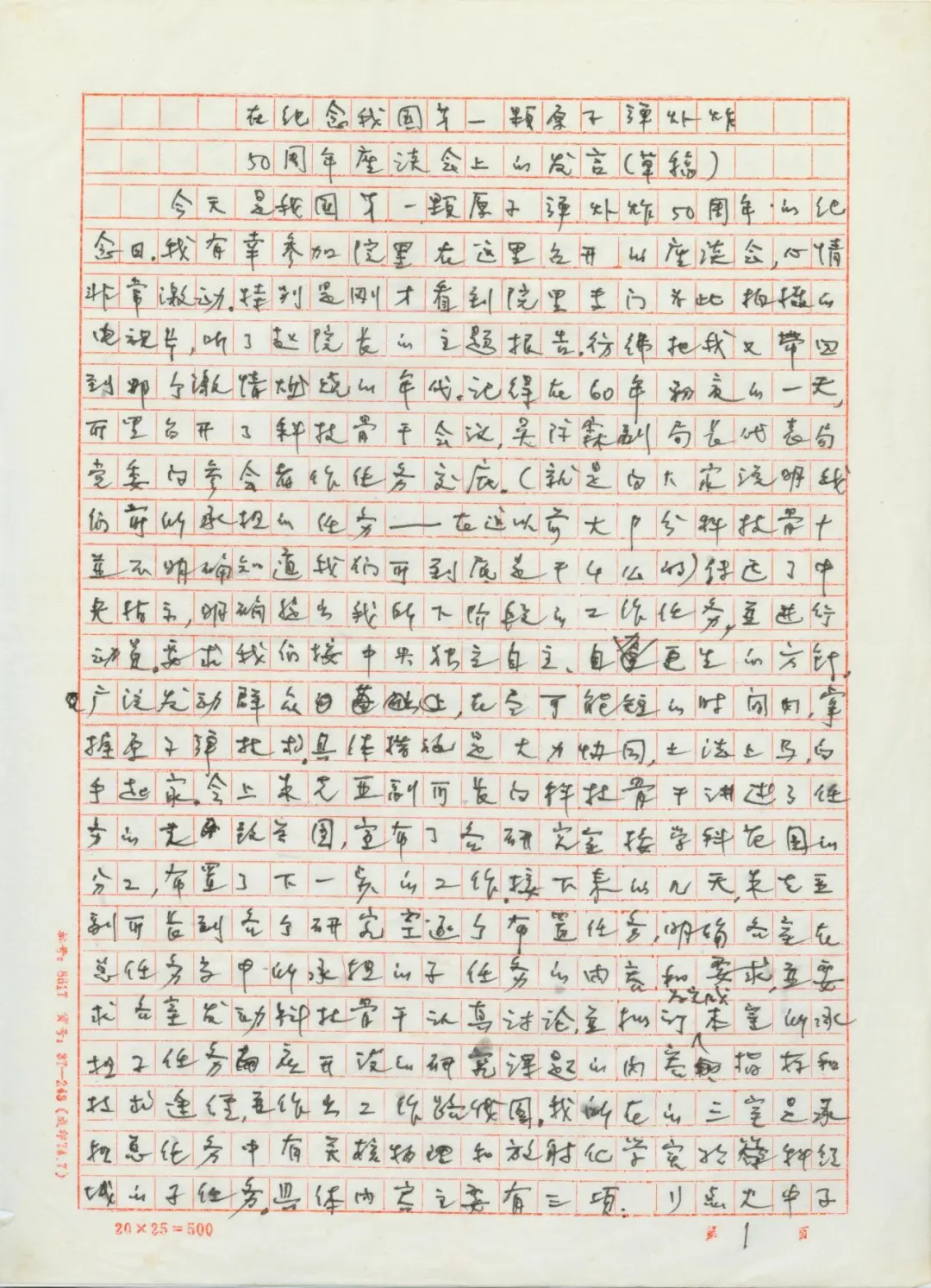 胡仁宇在纪念我国第一颗原子弹爆炸50周年座谈会上的发言(第一页)来源丨中国科学家博物馆