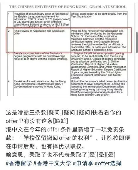 最近,留学圈的“吃瓜群众”和准留学生们,都被一则来自香港中文大学(以下简称“港中文”)的消息炸开了锅。一份录取通知书(Offer)上,赫然多出了一行此前从未出现过的文字:“本院保留随时修改或撤回录取通知的最终解释权。”