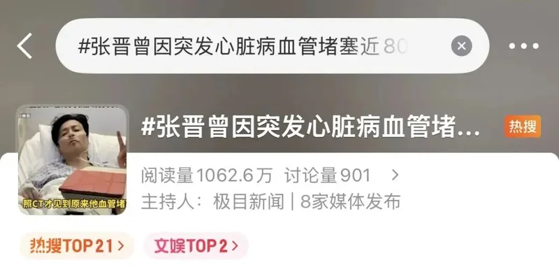 此事发生后,经详细检查,张晋被确诊冠状动脉血管堵塞近80%,已达急性心肌梗死临界值。