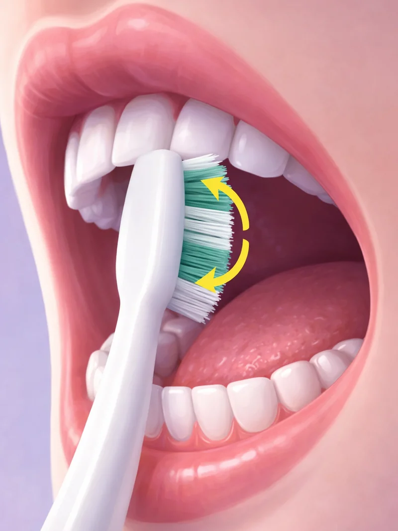 刷毛应与牙齿、牙龈成45度角,以画小圈的方式活动。