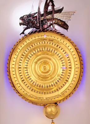这是个怎样的钟呢?它用一块24K镀金不锈钢圆盘做钟面,一米五的直径。虽然也是圆形,还有钟摆,但上面没有传统钟的指针和数字,而是用LED蓝灯从钟面上的均匀缝隙里射出光来,这些缝隙均匀排列在三个同心圆上,分别显示时、分、秒,每一秒都有灯在跳动,配上一种机械的吱嘎响,让你感到时间纯然地流去和丢失。