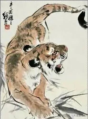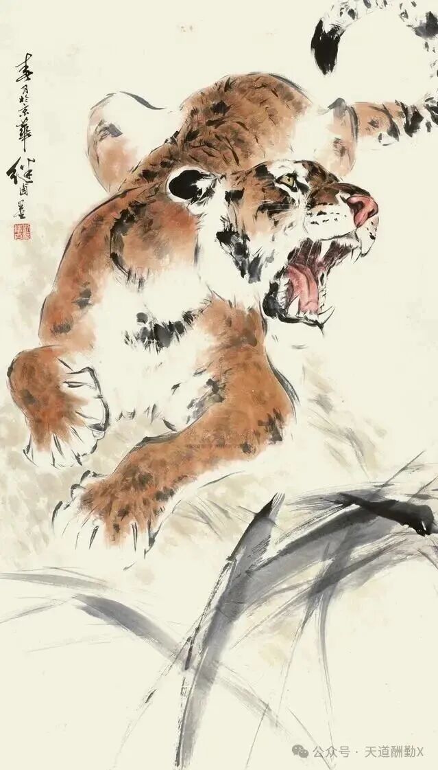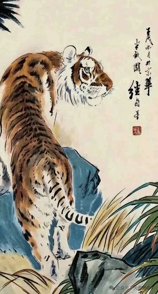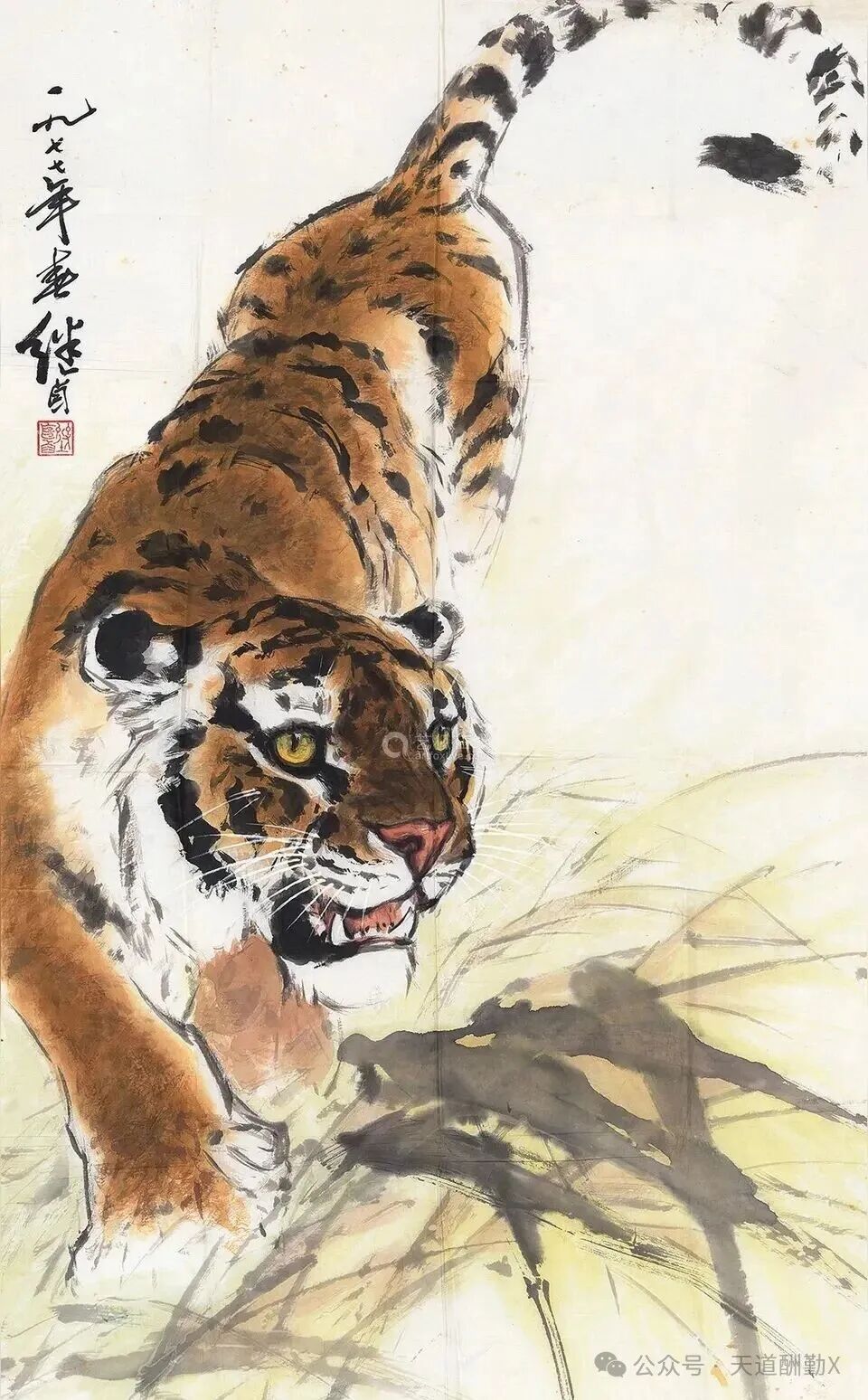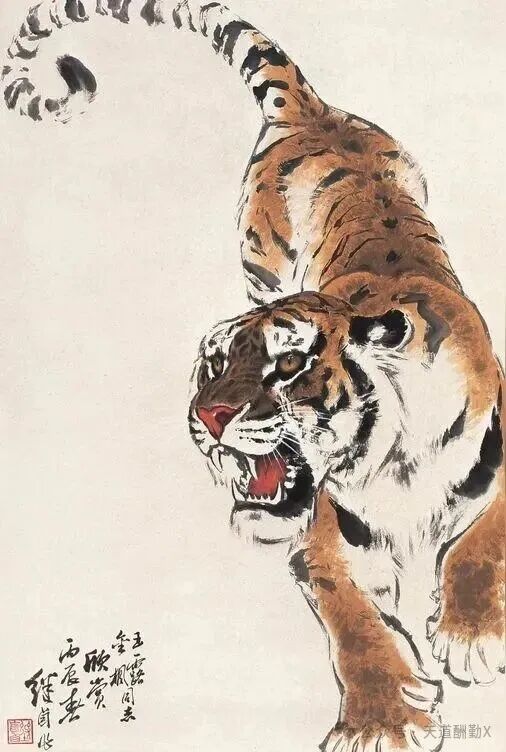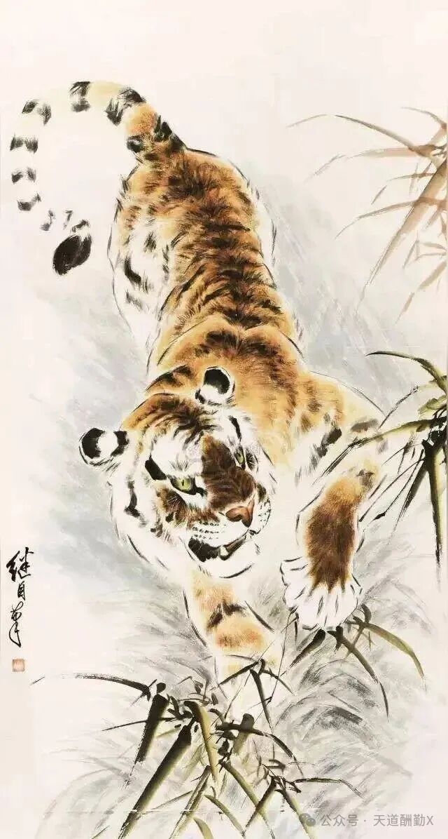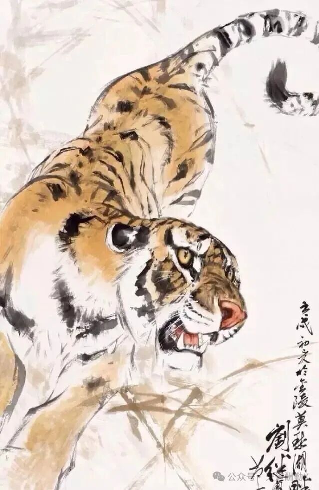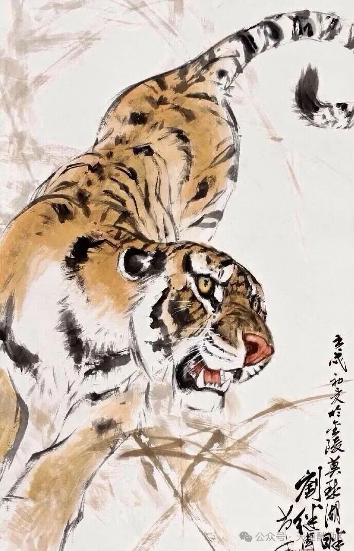 近现代画坛,能把老虎画得形神兼备、气韵双绝者,首推刘继卣。他承家学、融中西,以工写兼备之笔,写尽虎之威猛、灵秀与风骨,成为当代虎画巅峰。刘继卣画虎,不画皮相,专画虎魂。他常年写生,精研骨骼肌理与动态神情,摒弃刻板符号化造型,让每一只虎都有性格、有气场。静则沉稳如山,动则雷霆万钧,一眼望去,不怒自威。 刘继卣以一生功力,写就虎之王者气象。他笔下的虎,是自然生灵,是艺术经典,更是中国人心中威武不屈、奋...