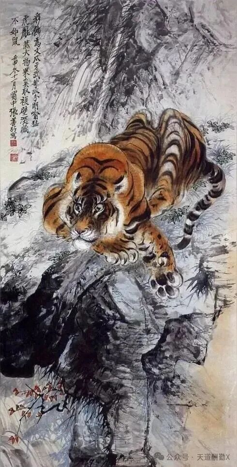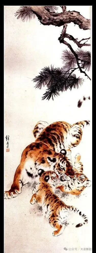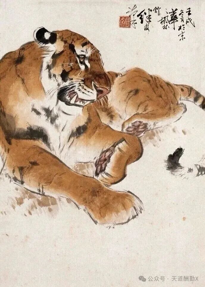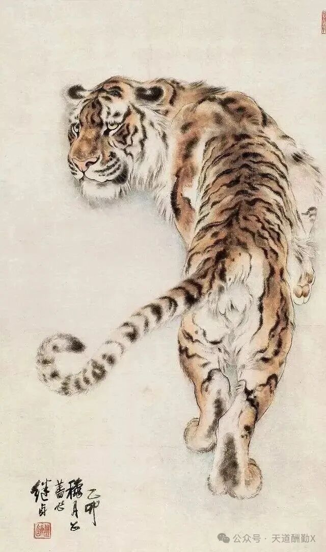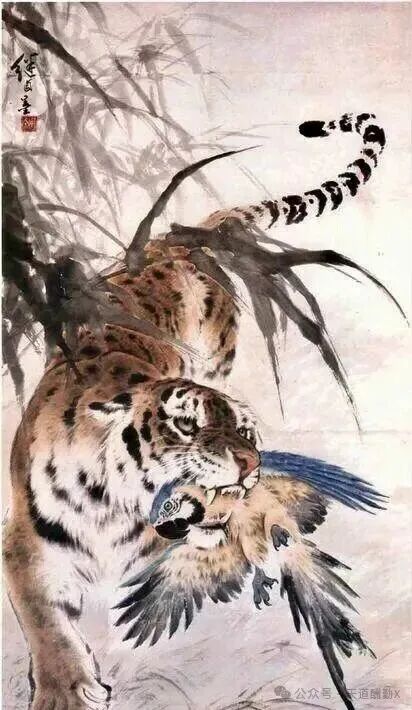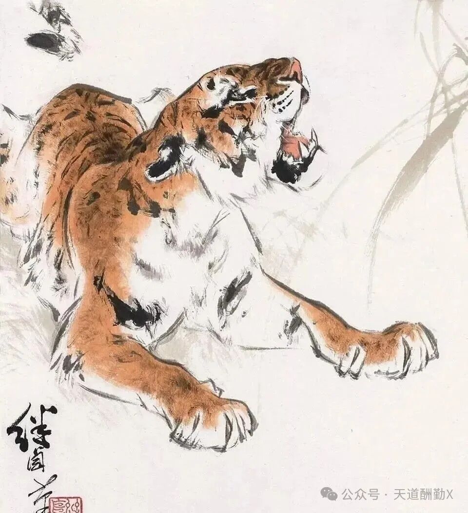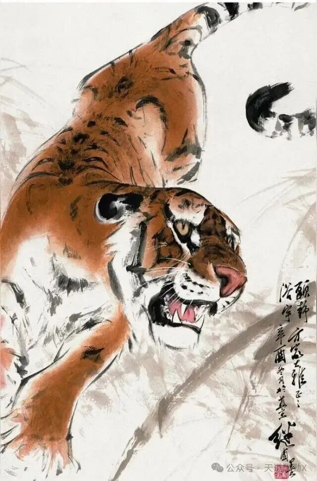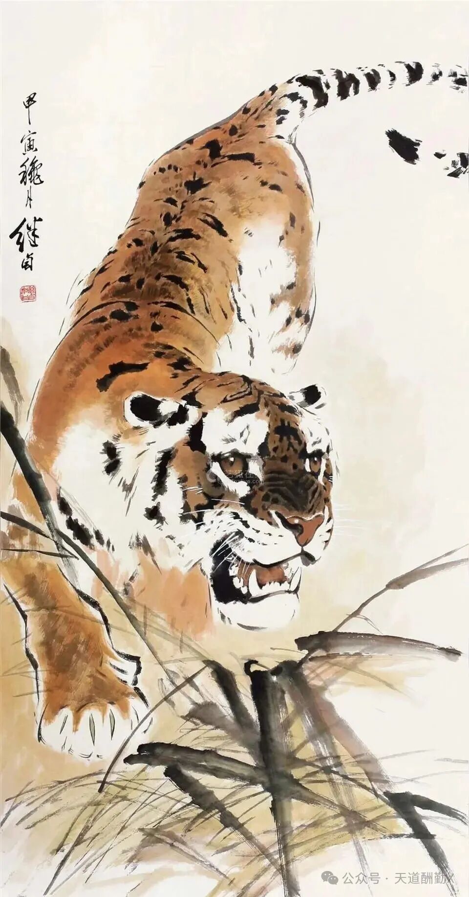 近现代画坛,能把老虎画得形神兼备、气韵双绝者,首推刘继卣。他承家学、融中西,以工写兼备之笔,写尽虎之威猛、灵秀与风骨,成为当代虎画巅峰。刘继卣画虎,不画皮相,专画虎魂。他常年写生,精研骨骼肌理与动态神情,摒弃刻板符号化造型,让每一只虎都有性格、有气场。静则沉稳如山,动则雷霆万钧,一眼望去,不怒自威。 刘继卣以一生功力,写就虎之王者气象。他笔下的虎,是自然生灵,是艺术经典,更是中国人心中威武不屈、奋...