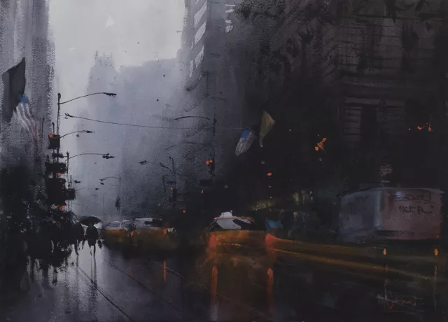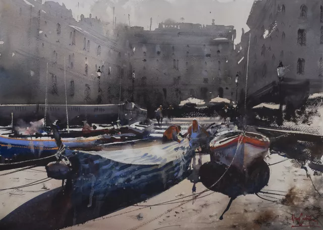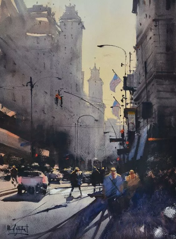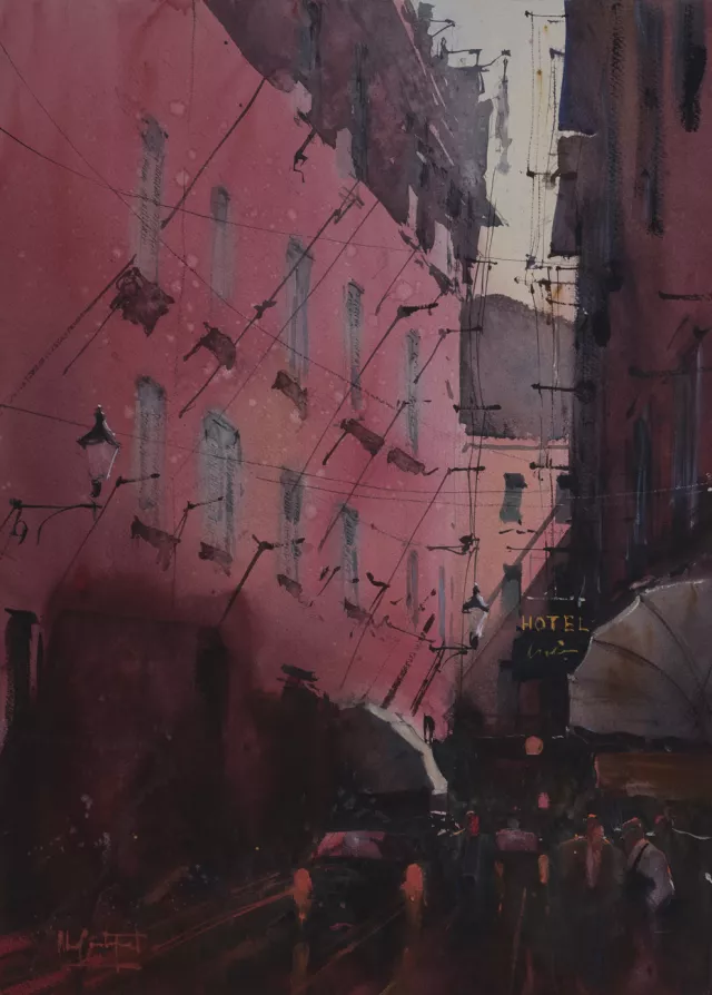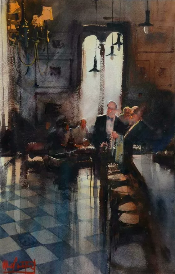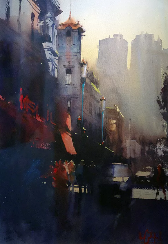 “艺术家需要一种必不可少的天赋,便是天大的苦功天大的耐性也补偿不了的一种天赋,否则只能成为临摹家与工匠。就是说艺术家在事物前面必须有独特的感觉:事物的特征给他一个刺激,使他得到一个强烈的特殊的印象。换句话说,一个生而有才的人的感受力,至少是某一类的感受力,必然又迅速又细致。他凭着清醒而可靠的感觉,自然而然能辨别和抓住种种细微的层次和关系:倘是一组声音,他能辨出气息是哀怨还是雄壮;倘是一个姿态,他能辨出是英俊还是萎靡;倘是两种互相补充或连接的色调,他能辨出是华丽还是朴素;他靠了这个能力深入事物的内心,显得比别人敏锐。”(丹纳)阿尔瓦诺就是具备这样一种天赋的水彩艺术家。