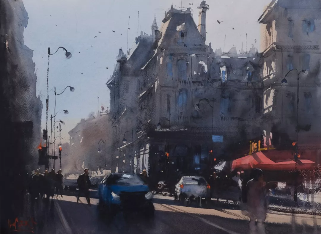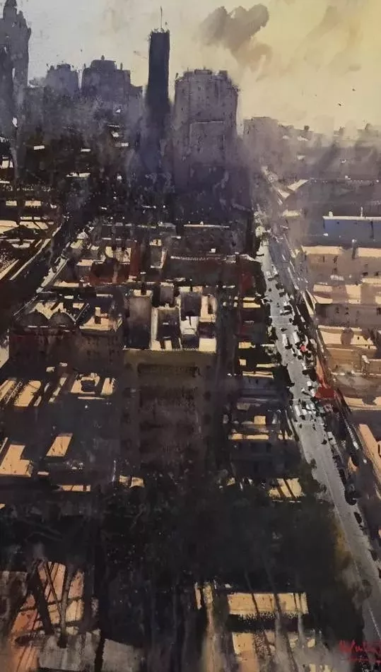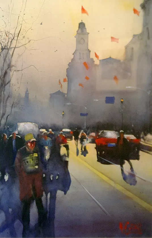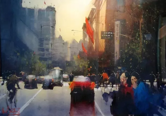 水彩画《星期一下午——上海》中所有表现日常生活与环境的细节:串流的车辆,穿越的人流,建筑上飘扬的红旗,商场繁荣日久的标志,无一不留着这座城市的美好。此情此景也正是阿尔瓦诺“艺术是完全洞察、绘画是基于直觉”这一观点的具体诠释。