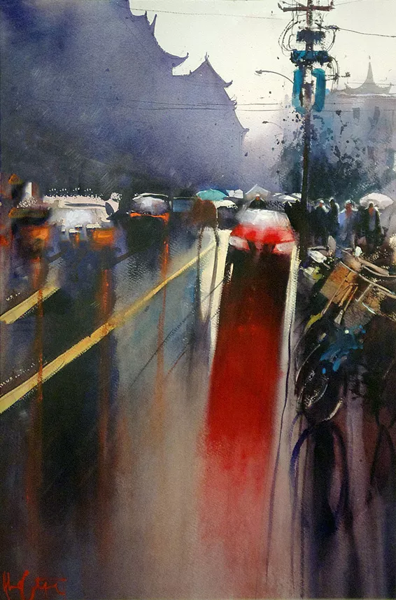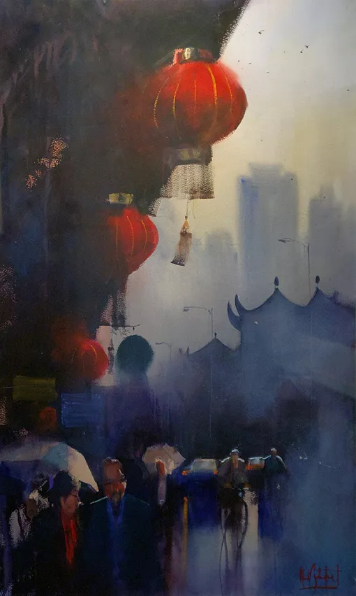 在表现中国题材的作品中,《红旗---上海》、《灯笼》、《风雨无阻》和《朱家角》系列等,几乎每一幅都有红色印迹。在《午后炽艳》的画面中,大部分的建筑都呈现着盛世中国红,庄严富丽,夺目耀眼。在这里红色象征着热情、奔放、欢乐、喜庆和祥和。在《都市系列》中的红色星点,则是生命的跳动,是希望的火焰。它们也恰好体现出了中华民族特有的民族色彩及其传统意蕴。