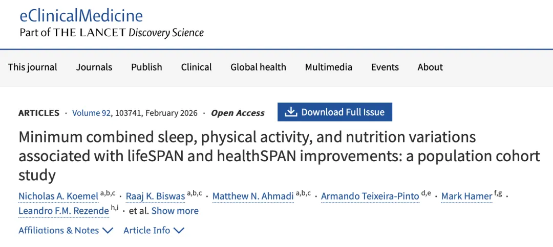 2026年,一项刊发在《柳叶刀》子刊《电子临床医学》上的研究总结出了一个“长寿公式”,即把“睡眠、运动、饮食”这三件事搭配到最佳状态,预期寿命能显著延长9.35年。