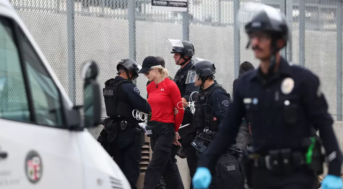 在这同时,部分示威者在洛杉矶市中心的联邦大都会拘留中心附近,同执法人员发生对峙。警方使用催泪气和胡椒喷雾驱散人群,并逮捕了多名拒绝离开现场的示威者。