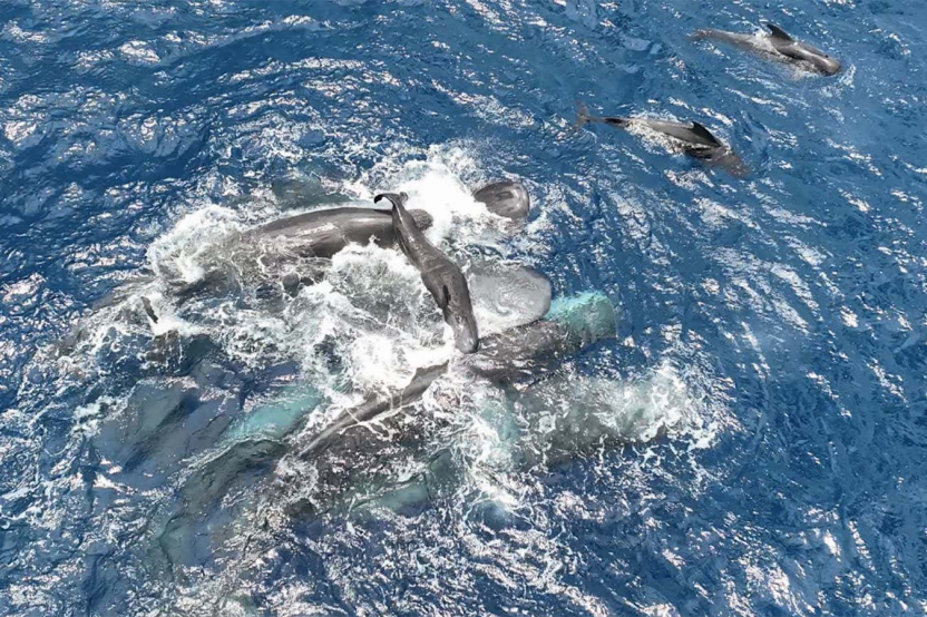 2023年7月,一群自2005年起便一直在加勒比海域监测抹香鲸群体的科学家注意到,该群体中全部11头雌鲸都聚集到了水面附近。巧合的是,当时研究人员正操控无人机在空中作业,从而得以观察并记录下这一事件。