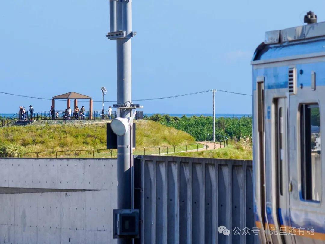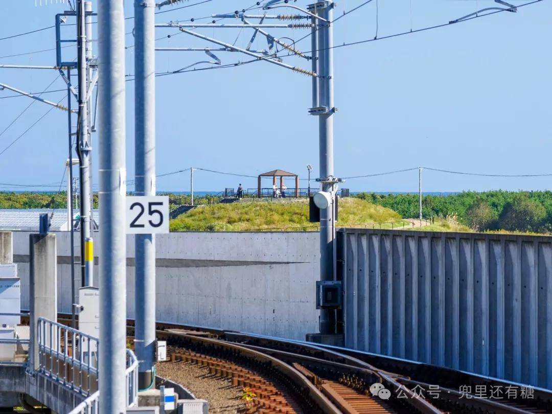 如果你稍微向右看,你可以透过高大森林的缝隙看到地平线。前景中的田野里似乎曾经有一个村庄。虽然车站到海岸的距离约为1公里,但2011年东日本大地震引发的海啸使仙台机场淹没了3米多的水。此后,海岸上修建了7m高的堤坝,从仙台机场站就可以一睹它的风采。
