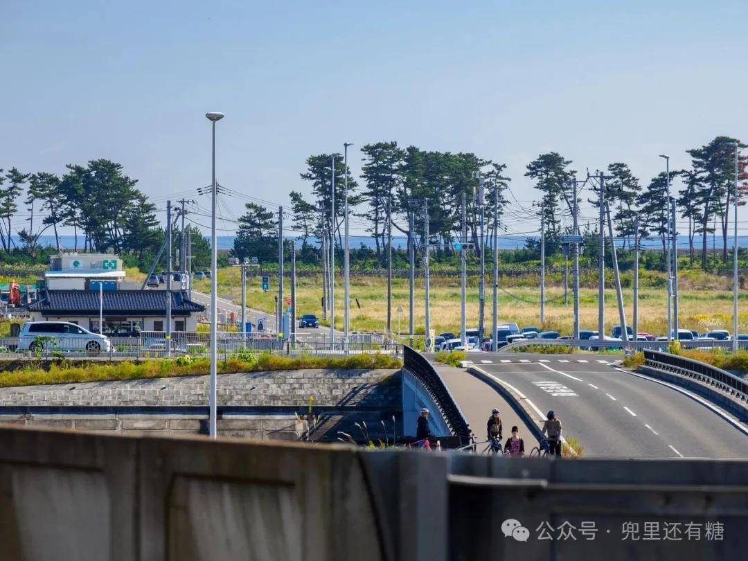 越过通往仙台站的铁轨,向东可以看到太平洋。中央是东日本大地震后开发的北釜防灾公园。该地区似乎曾经有一个村庄和一片防沙林,但地震后,它变成了一个防灾公园,有一个略高的“避难山”。