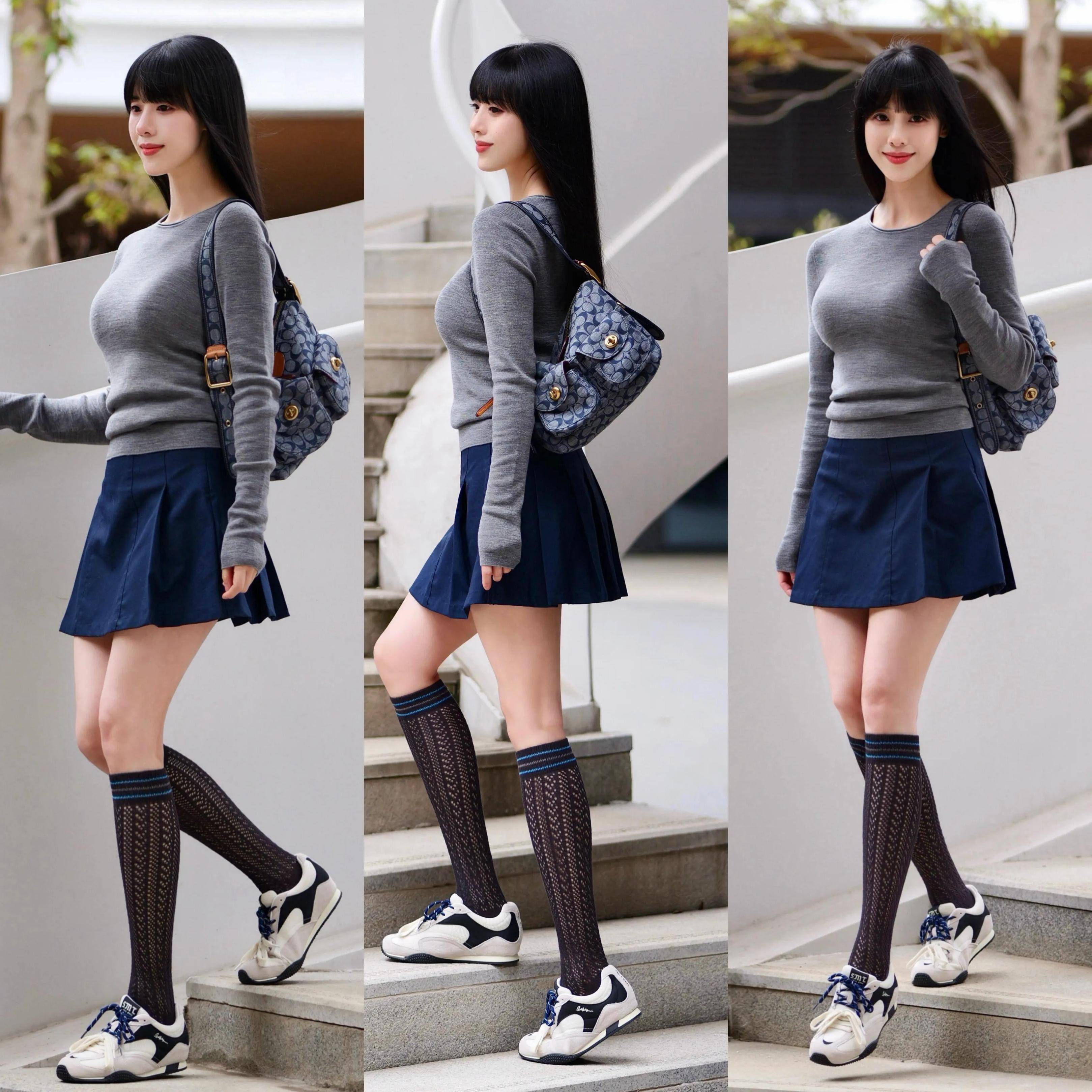 若是偏爱校园风的穿衣风格,不妨可以选择软糯亲肤的灰色针织上衣配上藏蓝色的鸭子 A 字短裙,脚踩新款设计版型的德训鞋和一款中筒袜,就能很好地勾勒出凹凸有致身形。