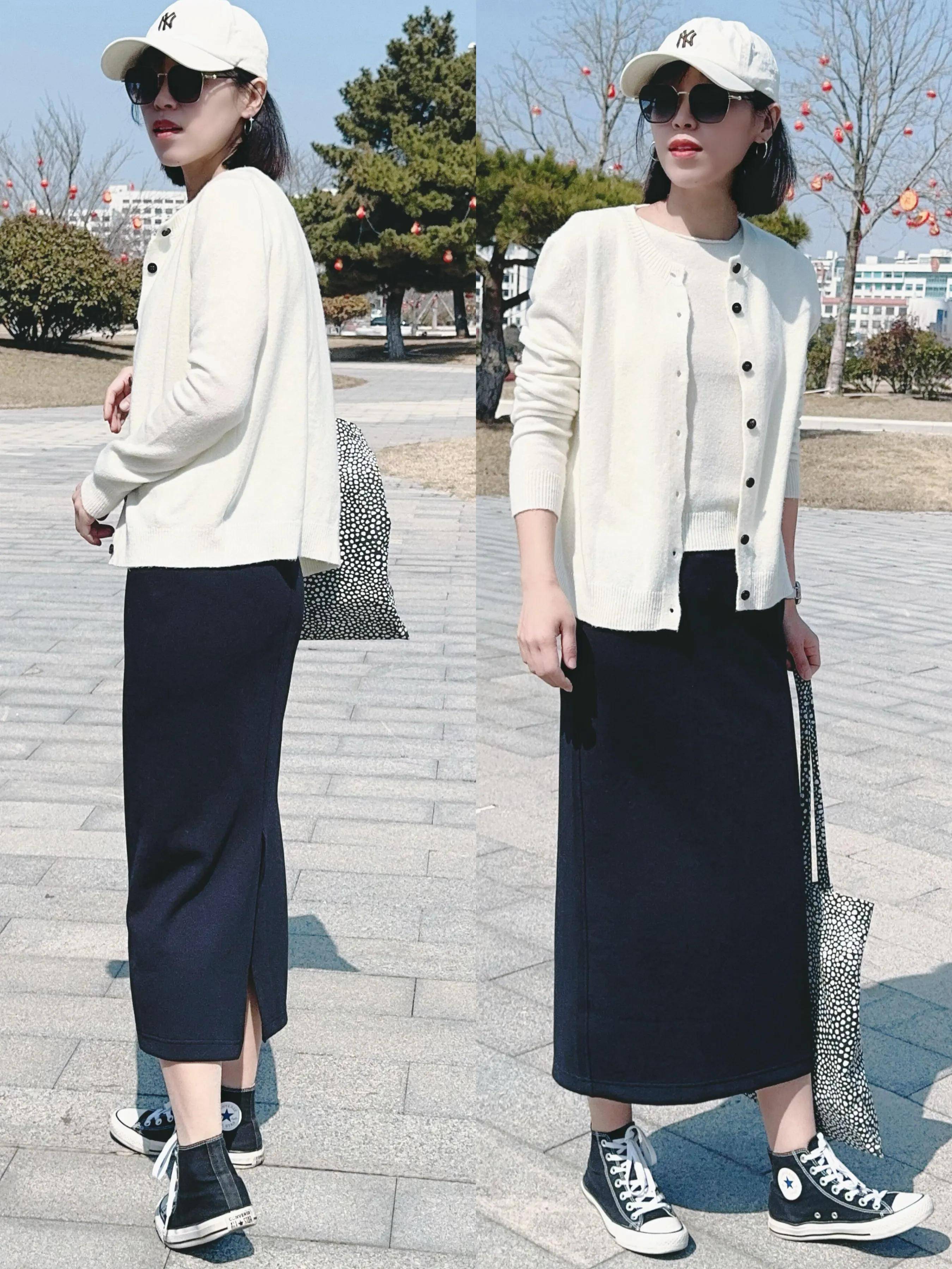 Tips ④:白色开衫+黑色直筒半裙+黑色帆布鞋