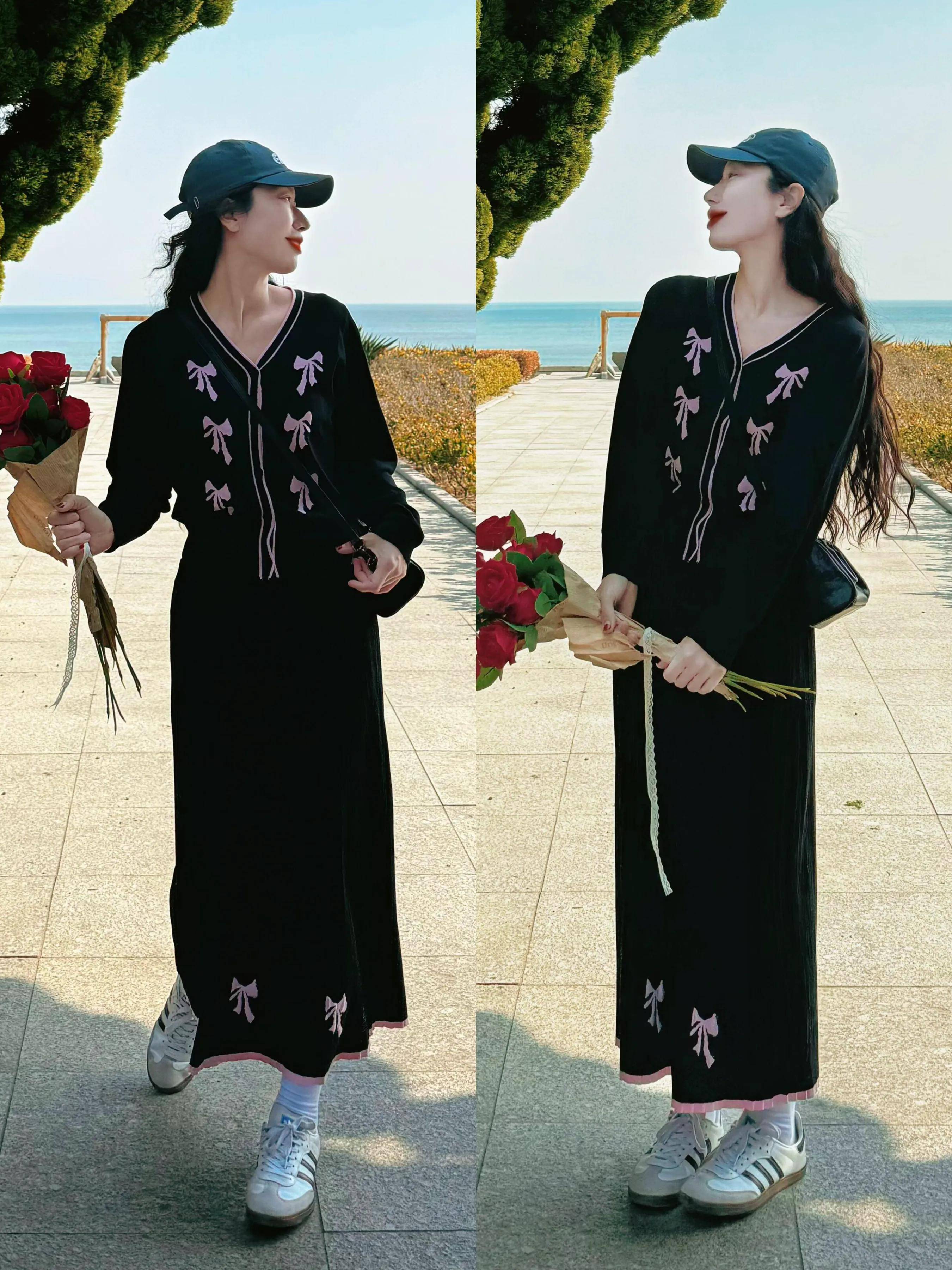 不妨选择上面这种黑色的刺绣印花针织裙装,配上一双经典款式的灰白拼接德训鞋,头戴牛仔棒球帽,利落休闲又自带温柔气质。