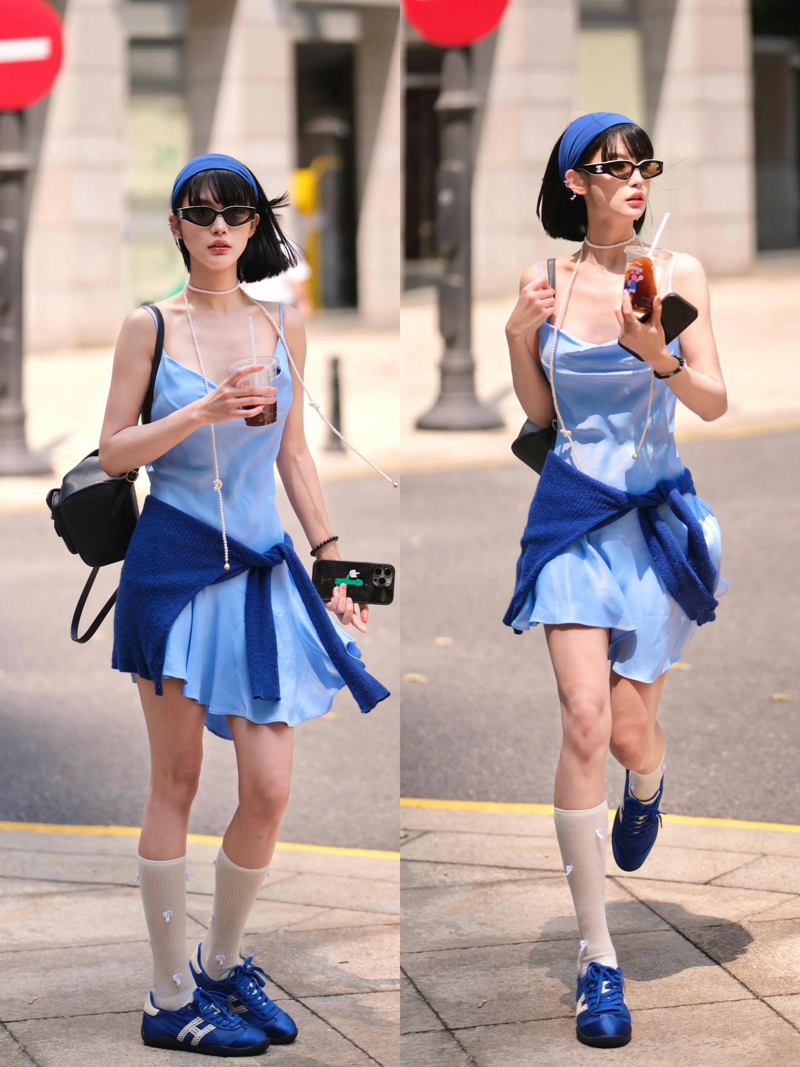 用雾霾蓝缎绸面料吊带裙配上一双蓝色德训鞋,不费力就能让你轻松拿捏小性感,走起路来自带风,少女感扑面而来。