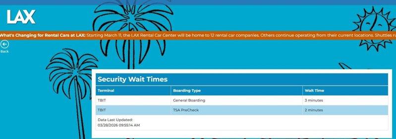 LAX官方网站flyLAX.com显示,28日上午10时Tom Bradley国际航厦普通安检与TSA PreCheck通道等待时间仅两到三分钟,几乎无需排队。(官网截图)