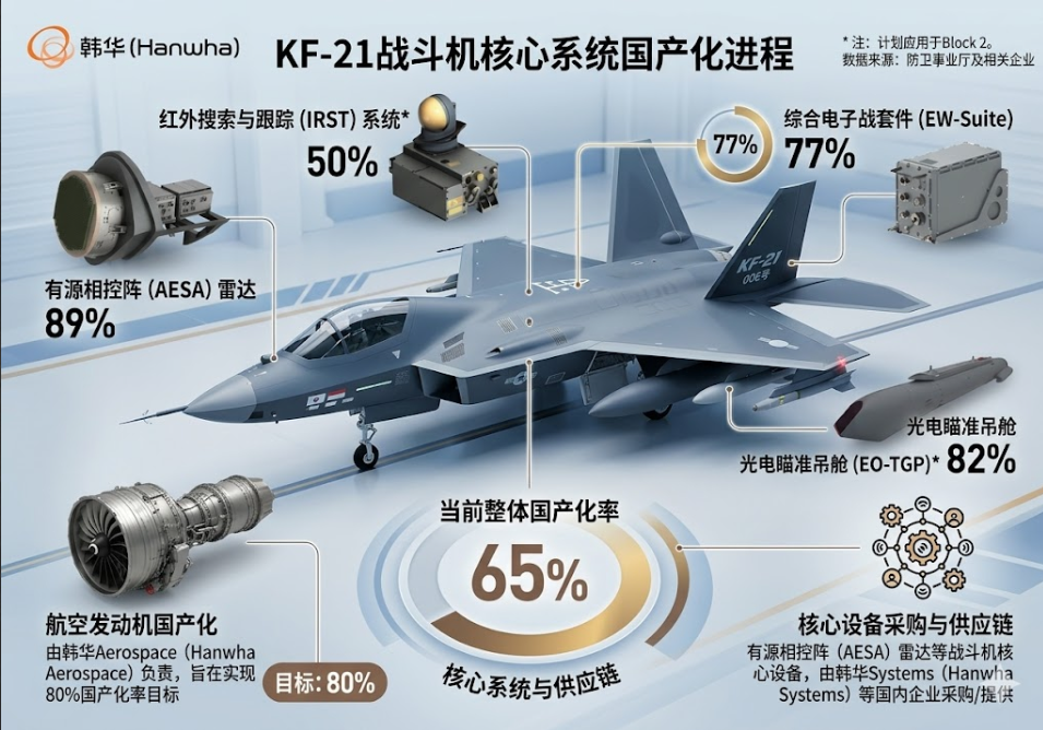 不过 KF-21 还是非常依赖欧美技术,其自主部分主要包括整机结构制造、部分航电子系统、韩制空地弹药、部分软件集成,国产化率不足 65%(目标数据)。发动机、弹射座椅、飞控和武器都高度依赖进口,而且韩国短期内很难摆脱这种依赖。任何一个环节被卡,都可能影响 KF-21 的外销,这也是决定未来 KF-21 命运的最大罩门。