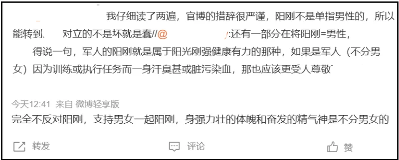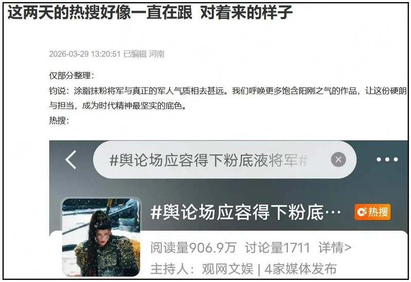 前脚官媒强调呼吁让硬朗和担当成为时代精神最坚实的角色,后脚热搜就出现了“舆论场应容得下粉底液将军”。