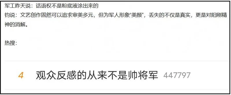 官媒继续发声强调话语权不是粉底液涂出来的,文艺创作固然可以追求审美多元,但不能丢失真实,不能消解精神,热搜又来了一个“观众反感的从来不是帅将军”。