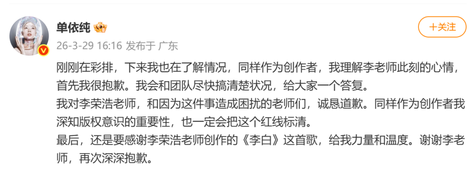 我对李荣浩老师,和因为这件事造成困扰的老师们,诚恳道歉。同样作为创作者我深知版权意识的重要性,也一定会把这个红线标清。