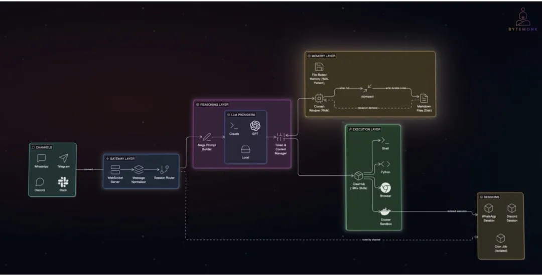 龙虾完整技术架构图 引自ByteMonk