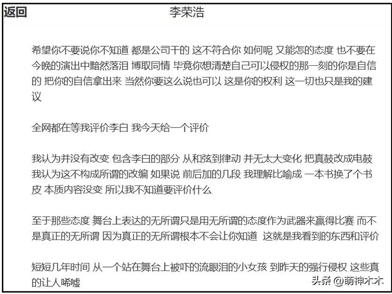 关于单依纯演唱会翻唱涉嫌侵权的事,李荣浩仅用两段话进行说明,接下来每一段都是带有一定情绪的控诉。