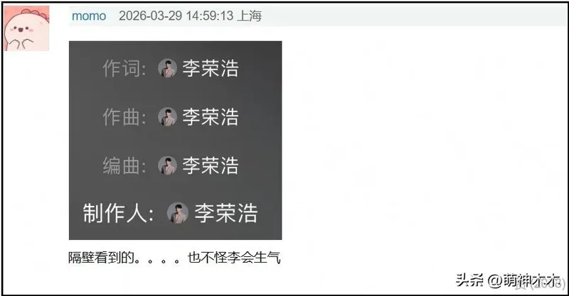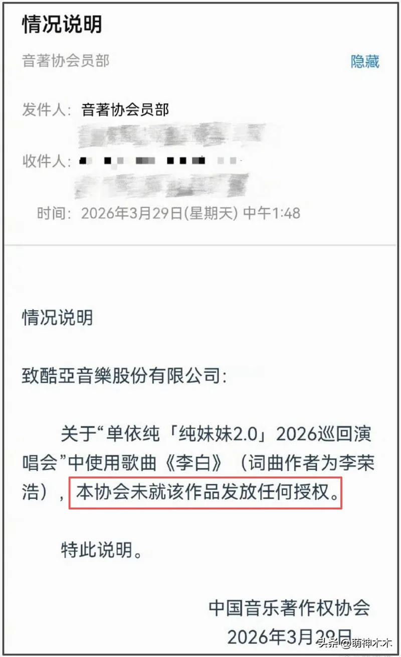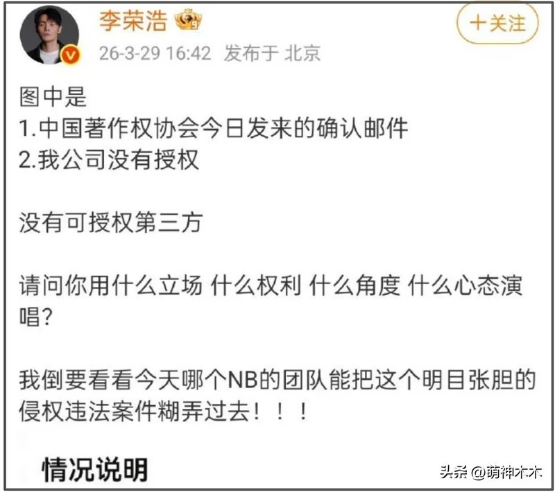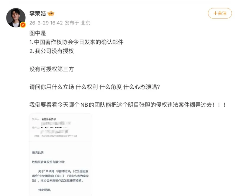 随后,李荣浩再发文质问,并晒出音著协确认邮件。其表示:“中国著作权协会今日发来的确认邮件,我公司没有授权,没有可授权第三方,请问你用什么立场、什么权利、什么角度、什么心态演唱?我倒要看看今天哪个团队能把这个明目张胆的侵权违法案件糊弄过去”。