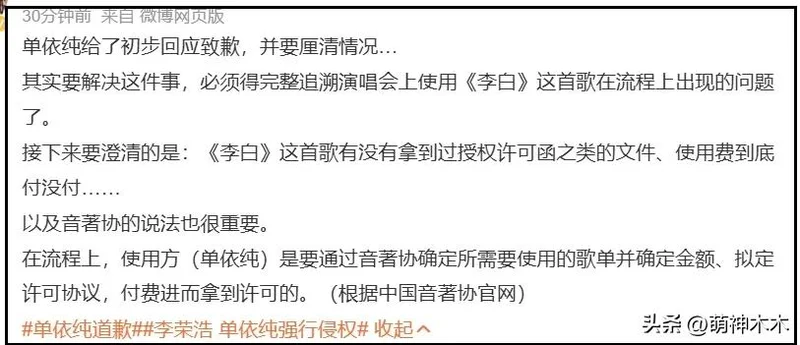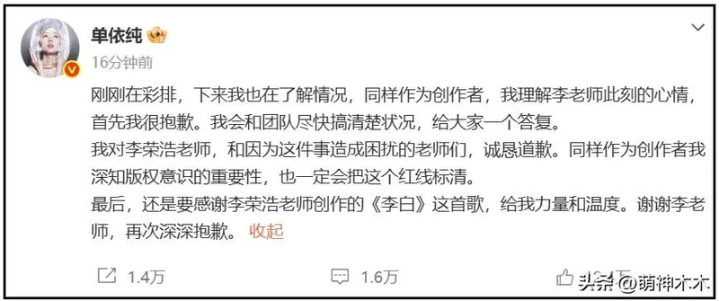 被指责“强行”侵权演唱《李白》,单依纯道歉!李荣浩再发四连问:无授权你用什么立场、什么权利、什么角度、什么心态演唱?