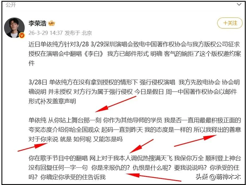 内娱又有明星正面开撕啦!41岁歌手李荣浩公开指责单依纯侵权,发了长文炮轰对方在没有拿到授权的情形下强行演唱了李荣浩原创歌曲《李白》,不愧是原创歌手,自己靠自己吃饭就是硬气。
