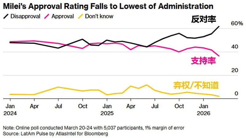 据AtlasIntel为彭博进行的“拉美脉搏”调查,3月20日至24日对5037名受访者的调查显示,米莱支持率降至36.4%,较2月下降5个百分点,反对率则逼近62%。