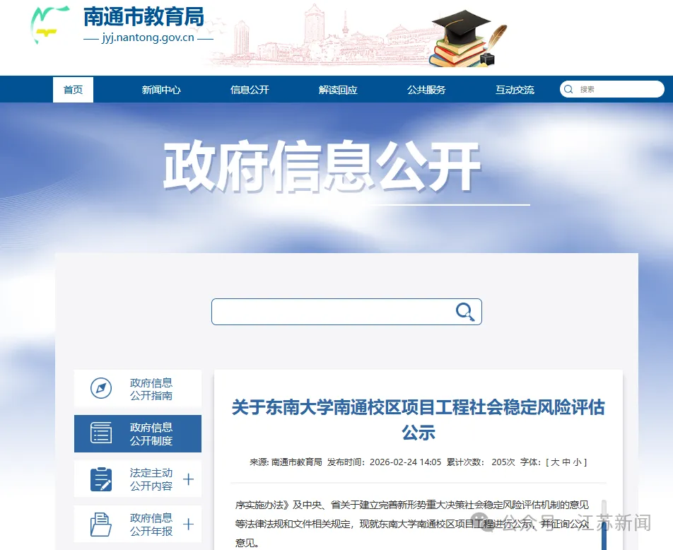 2月24日,南通市教育局发布《关于东南大学南通校区项目工程社会稳定风险评估公示》,就东南大学南通校区项目工程进行公示,并征询公众意见。(此前报道:南通将迎来第一所985大学)