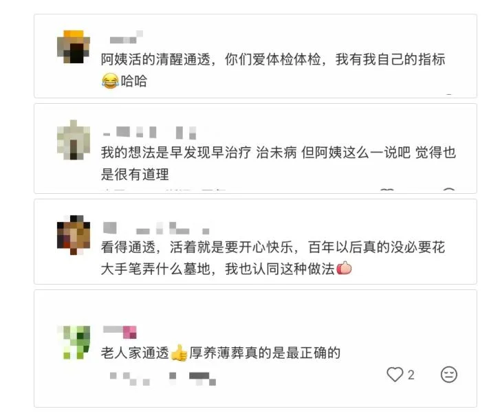 老人还说,活着的时候开心最重要,墓地那些都是做给别人看的,留在心里纪念就好了。墓地买得好就代表孝顺吗?活着时孝顺时才重要。“如果真的到了生命结束的那一天,墓地不是必需品,撒向大海,我最欢喜了”。