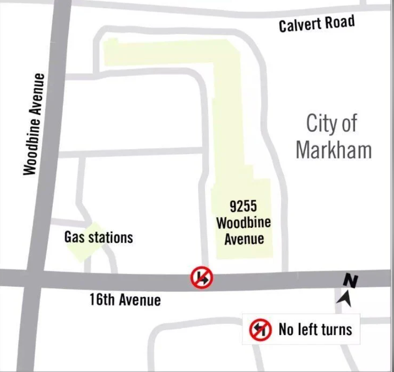 约克区正在对从9255 Woodbine Ave.驶出的车辆实施左转限制。这将阻止向南行驶的车辆左转进入16th Avenue。