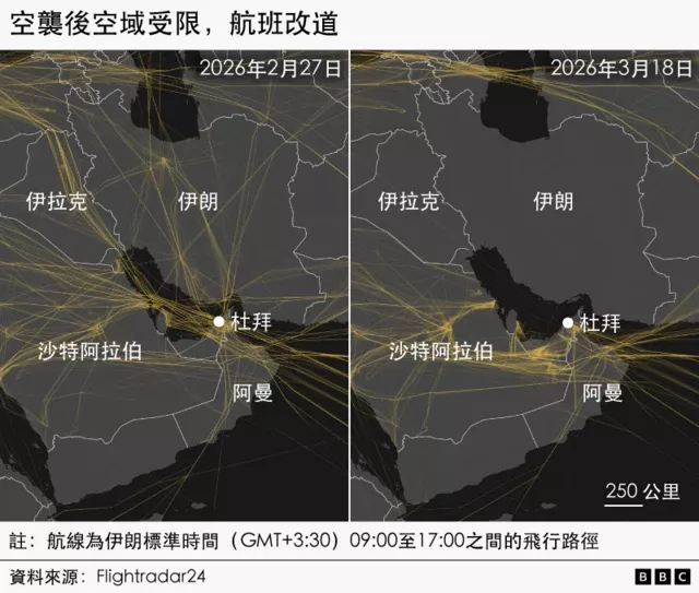 这些海湾地区的枢纽城市,一向运作顺畅,但在2月底美国和以色列首次对伊朗发动攻击后陷入停摆。随着区内空域关闭,飞机被迫停飞,一些已起飞的航班也被迫折返。