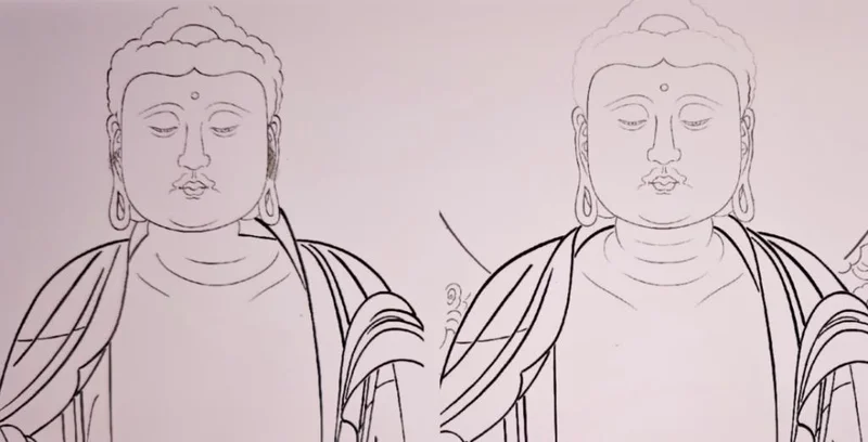 团队工作人员介绍:“主尊药师佛的头部和身体之间,有大约5厘米的缝隙。修复师在拼接时,将药师佛脖颈右边的一条线与衣领线相连,左边则将衣领外轮廓线误读为内部结构线。结果,佛首向右肩偏移,改变了原始造型。”