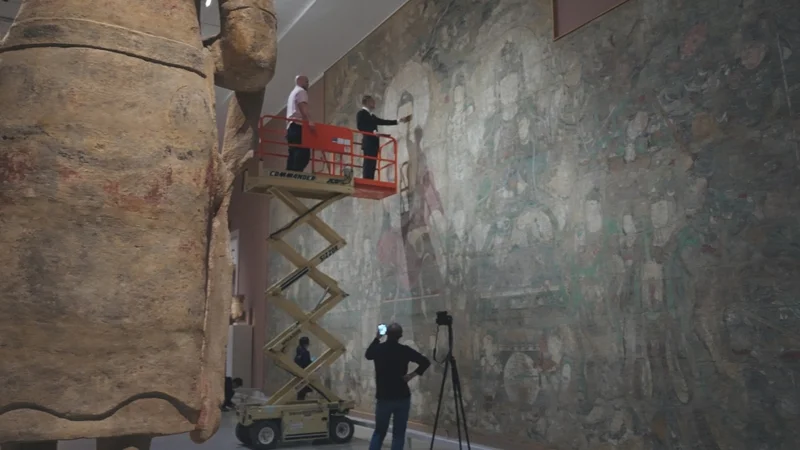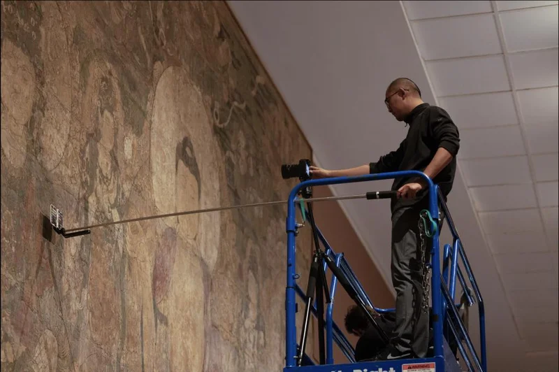 此后两年间,这支团队四度赴美,在几乎“贴着原作”的条件下展开高精度测绘、校色与临摹,试图以“文物复制级现状临摹”重建这幅壁画的形制、肌理与时间痕迹。目前这一临摹修复项目已临近尾声,计划在2026年9月举办结项展览,中国艺术研究院壁画临摹团队近日对《澎湃新闻|古代艺术》详述了四次赴美临摹的细节与思考。
